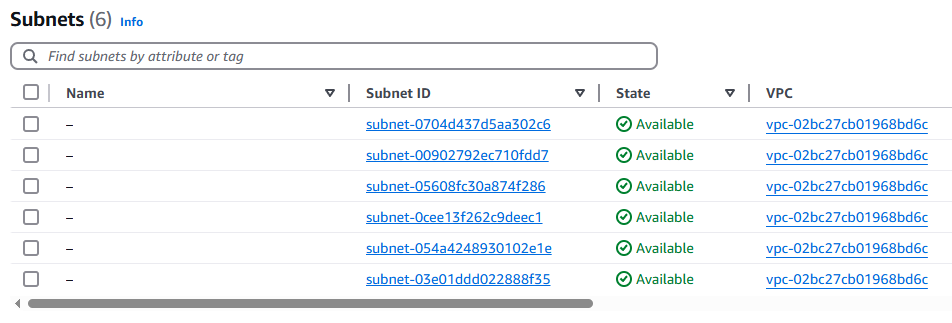VPC가 하나 있고, 여기에 서브넷이 6개나 연결되어 있다