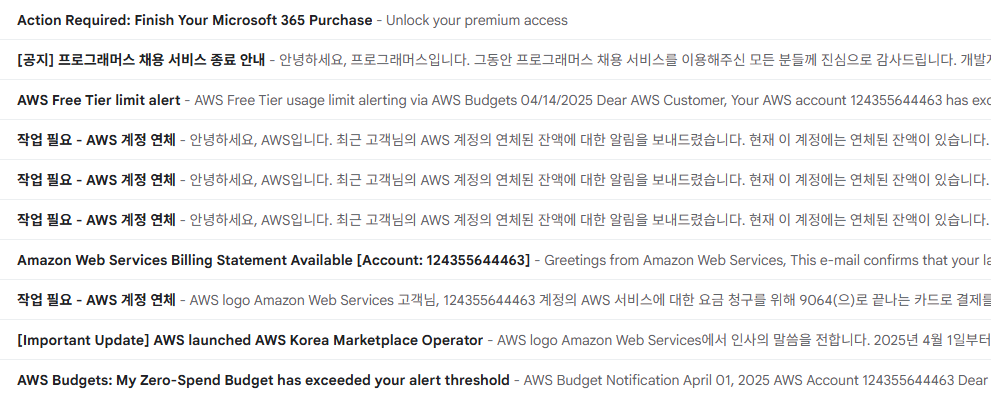 오늘도 Gmail에 AWS 연체가 되었으니 납부하라는 고지서가 들어오고 있다. 😭
