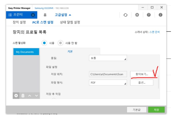고급설정 > PC로 스캔설정 > 아무것도 손대지 말고 하단의 기본값 클릭 후 > 저장
